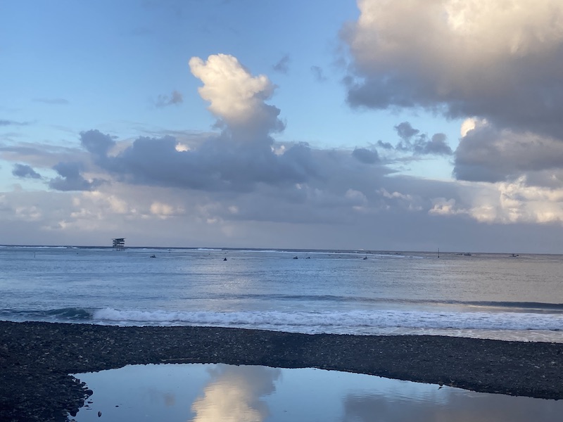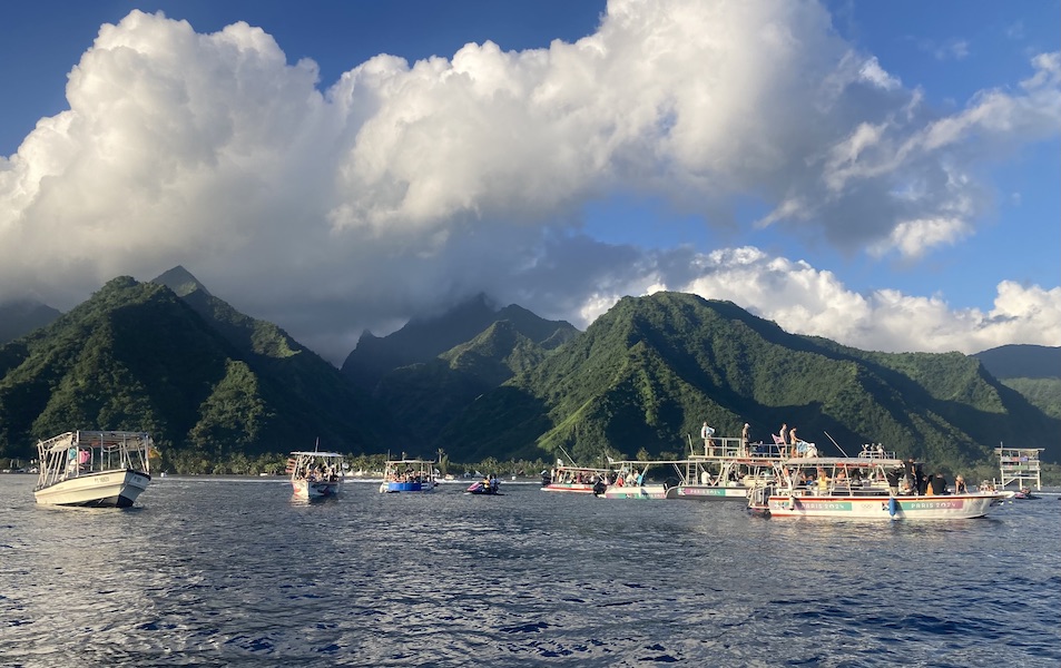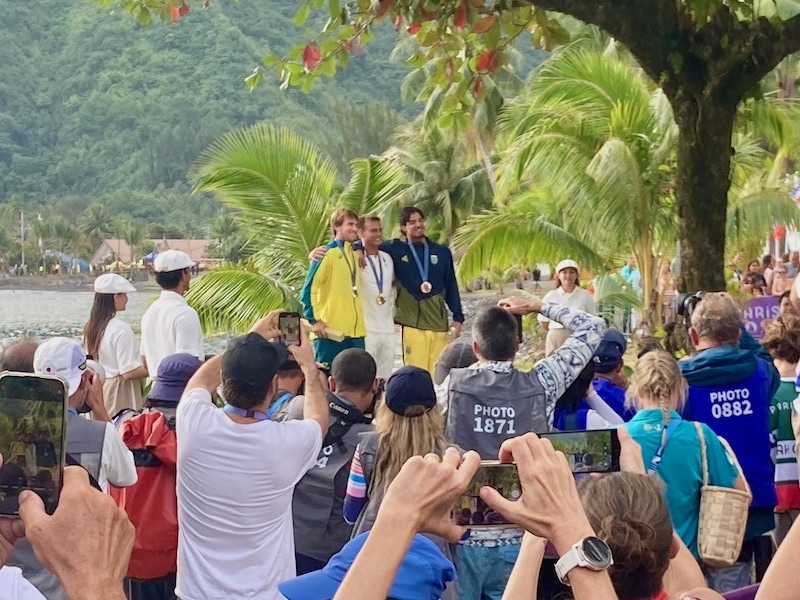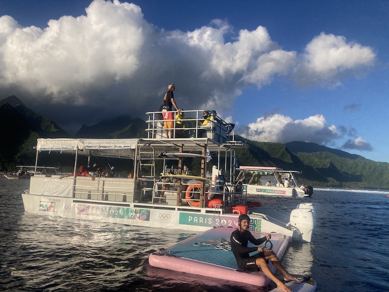 Guillaume a finalement eu un peu moins de travail que prévu et a pu profiter à plusieurs reprises de l’ambiance de la fan zone. Quant à moi, j’ai eu la chance de rejoindre pendant une demi-heure la zone de compétition à l’arrière d’un jet-ski pour profiter du spectacle. Nous avons également vécu l’émotion de la Marseillaise au pied du podium de Kauli Vaast, l’enfant du pays, porté par tous les Tahitiens.