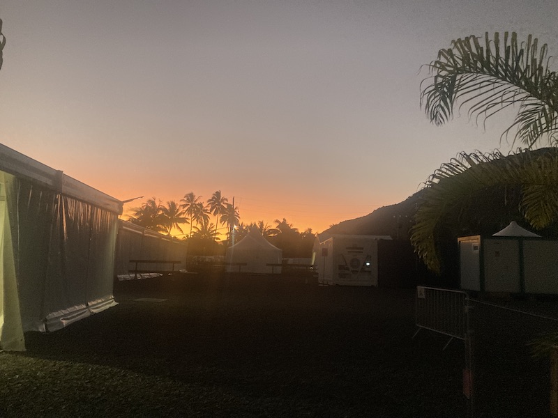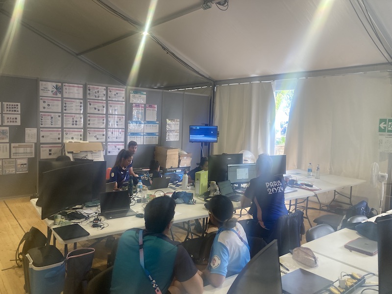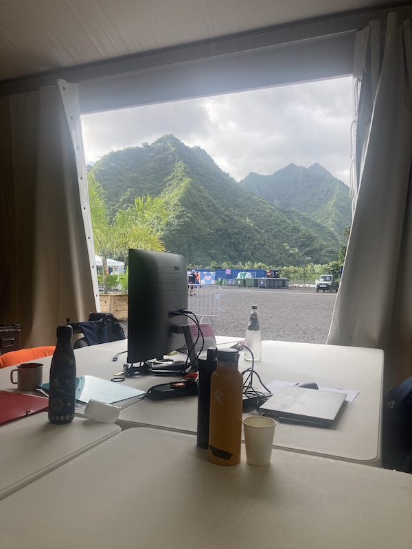 Guillaume était affecté à l’équipe Transport en tant que chauffeur pour les équipes et staffs présents sur place, tandis que je m’occupais de tâches comptables et administratives. L’occasion de nous immerger dans le projet olympique et ses coulisses, en travaillant durant plus de deux semaines sur le site envoûtant de Teahupo’o.