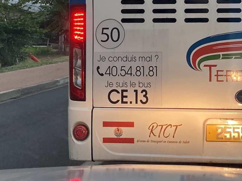 - Les curieux affichages derrière chacun des bus (à prononcer à l’anglaise « beusse », ne me demandez pas pourquoi !) de la compagnie qui fait le tour de l’île #balancetonbus