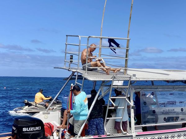 La compétition s’observe depuis des bateaux (taxi boat) qui emmènent les spectateurs depuis la côte à proximité de la vague.